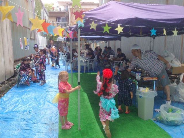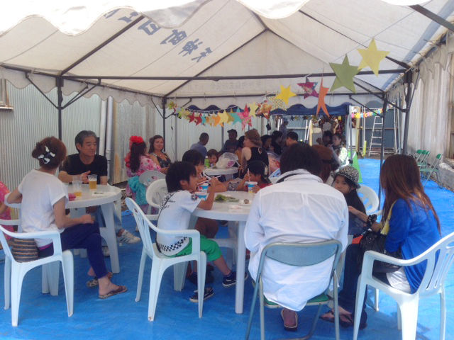 みんなで手作りした竹飾りを展示して、空き地であおぞらビアガーデンを開催しました。
