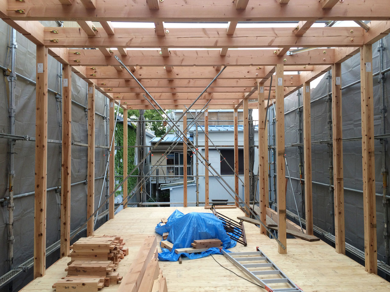 商店街は重機が入らないため、人力で木材を持ち上げる「手起こし」で組み上げました。