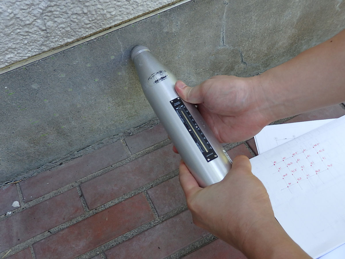 続いて外へ移動し、シュミットハンマーでコンクリート基礎の圧縮強度を測定します。