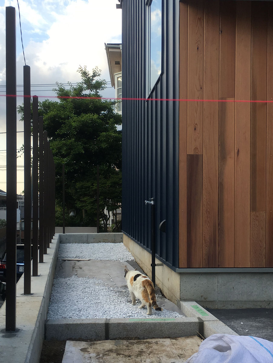 夕暮れ時、竣工検査に訪れた近所の三毛猫さんは、無言のままお帰りになりました。