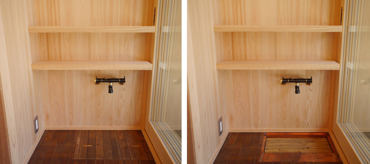 縁側には客人をもてなす水屋を設えました。既存フローリングの蓋を開けると、銅板落としと丸竹で製作した水皿が現れます。