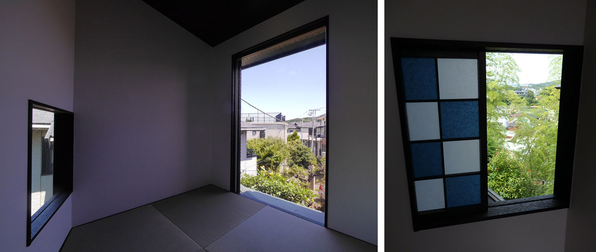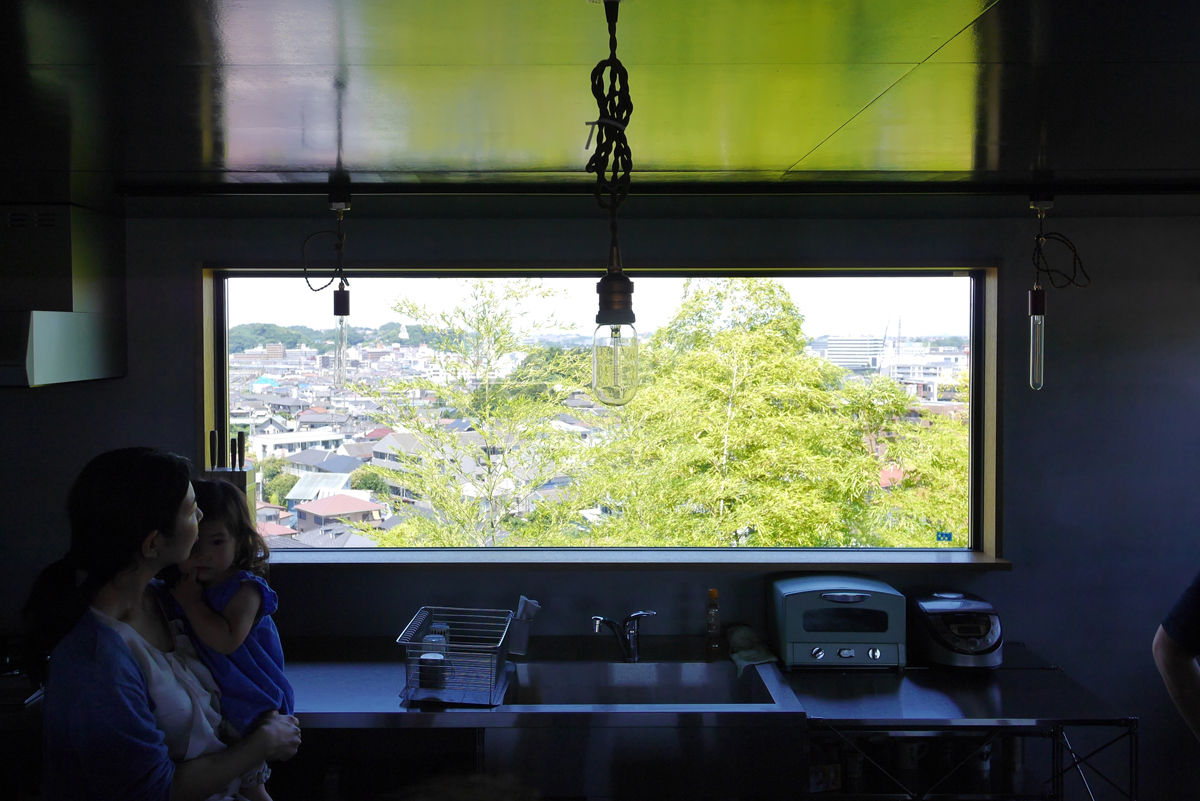 新設した水平窓からは鎌倉の街並みや大船観音を一望できます。半光沢黒塗装の天井に外の緑が映り込みます。