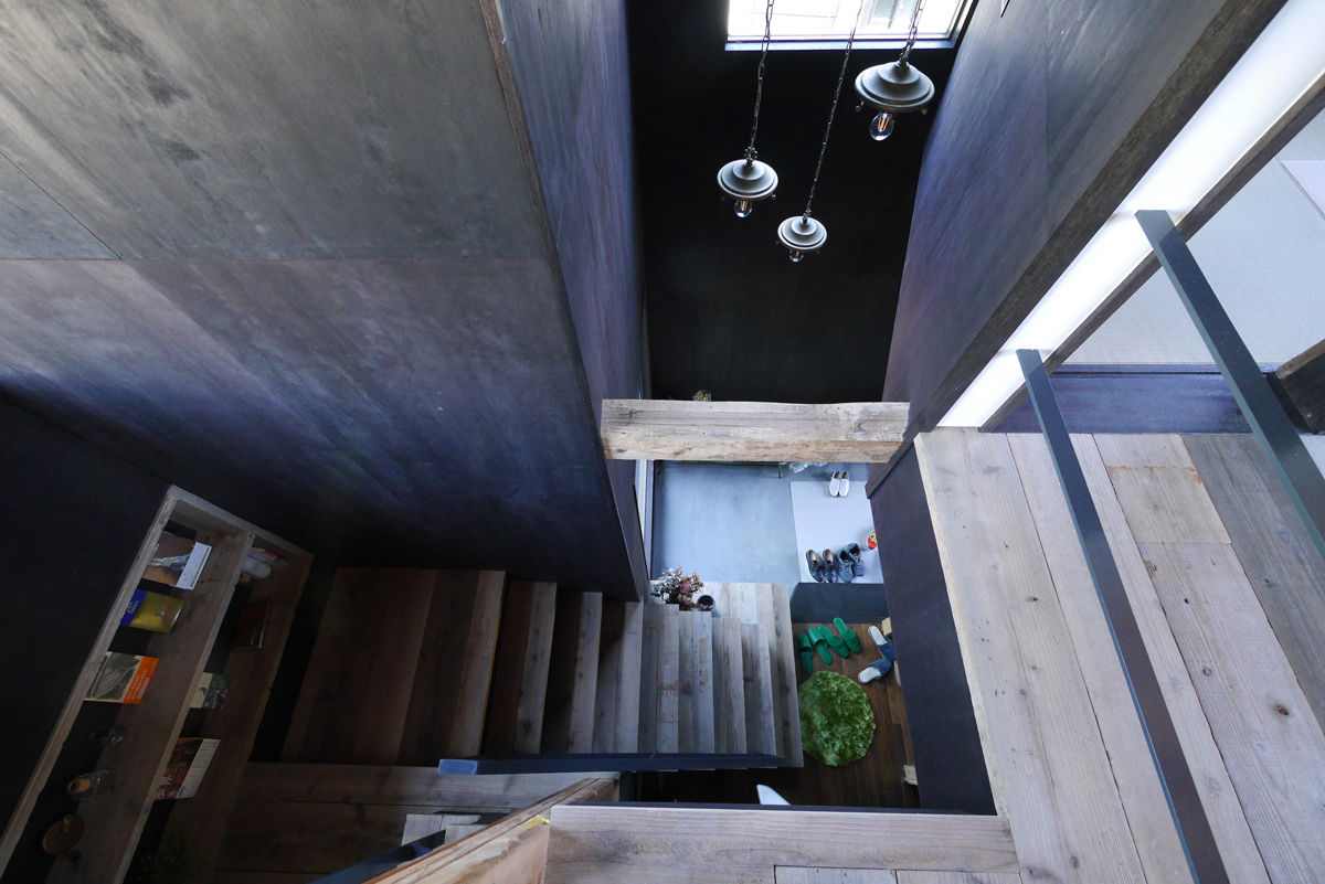 階段の踏板は杉足場板、壁はラワン合板にオイルステイン塗装。吹き抜けの大きなペンダントライトは既存照明を加工し再利用しています。