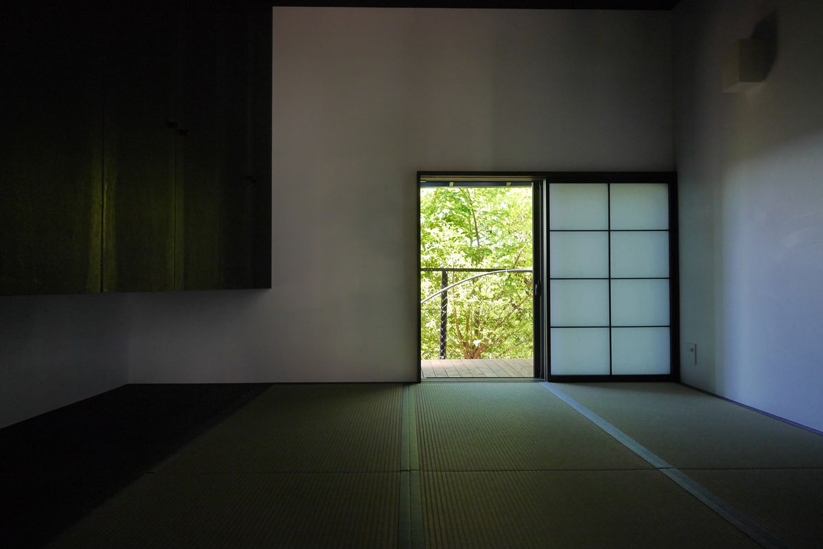 2階に設けた2畳の書斎。ひっそりとした隠れ場で気分が切り替わる。小さな障子戸を開けると、玄関と竹林を見下ろすことができます。同じ景色でも部屋によって見え方が異なるように設計しています。