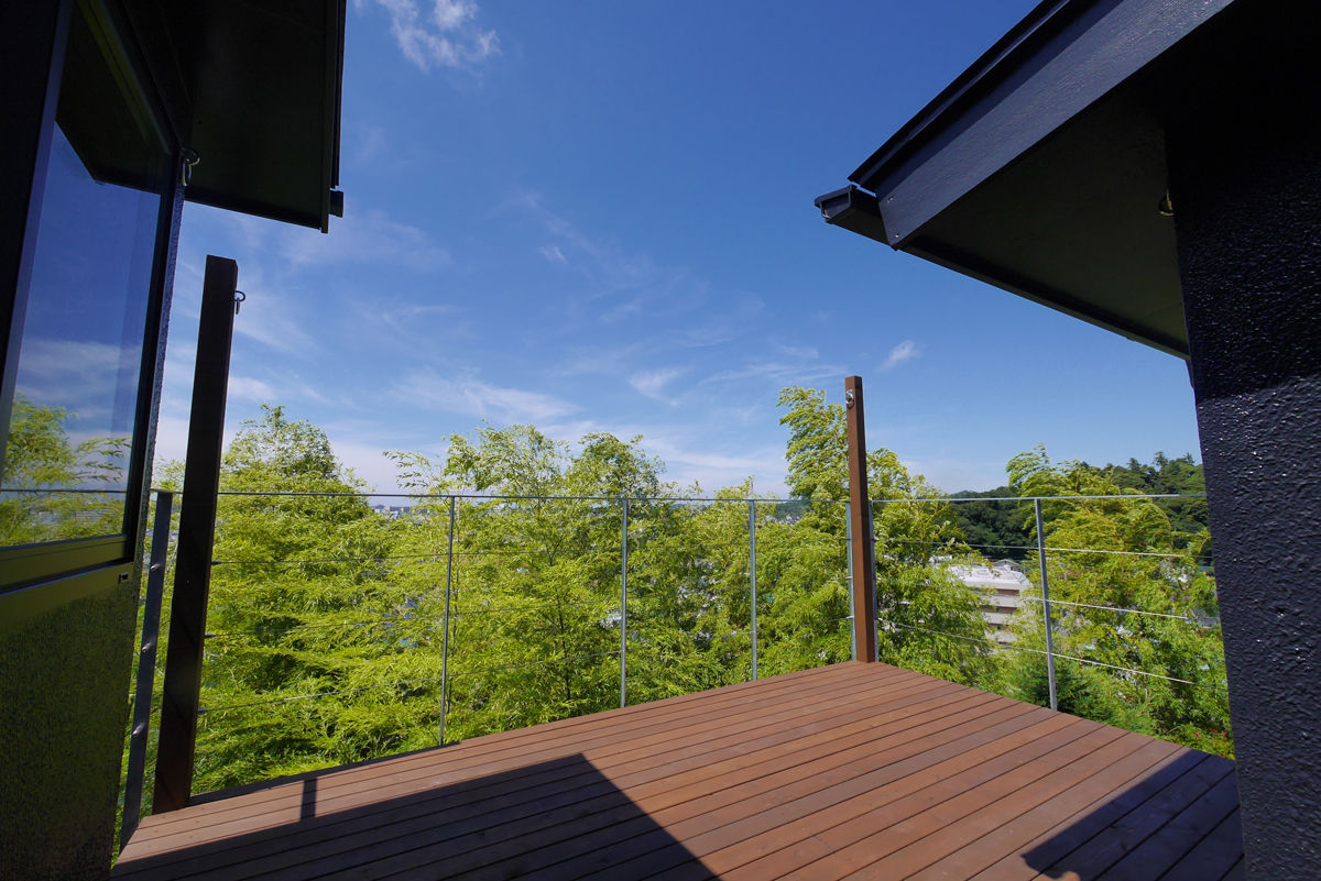 キッチンとリビングの間に設けたバルコニーはバーベキューを楽しむことができる外部リビング。両端の柱にはハンモックや日除けを吊るすことができます。家の中でこの場所からだけ富士山を望むことができます。