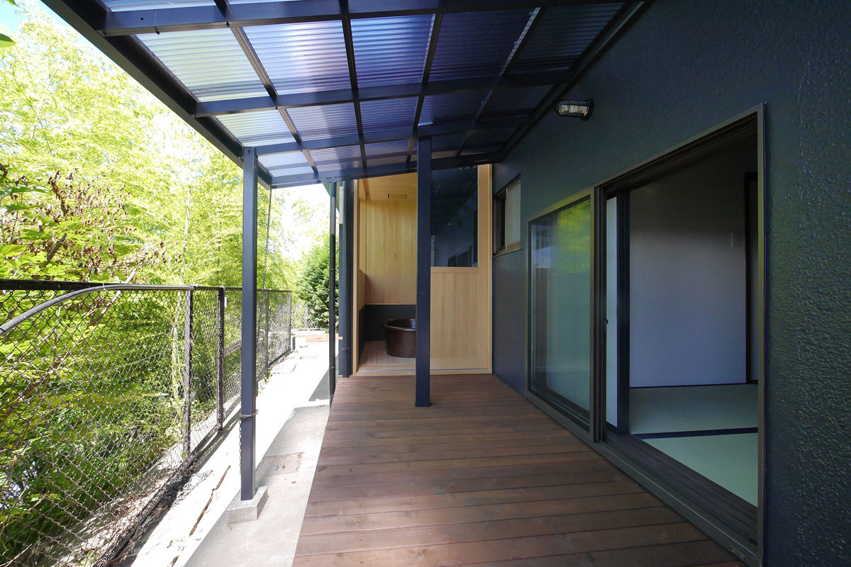 奥が浴室、右が和室。既存の鉄骨フレームを利用し、高さを抑えた半透明の屋根を新設しました。