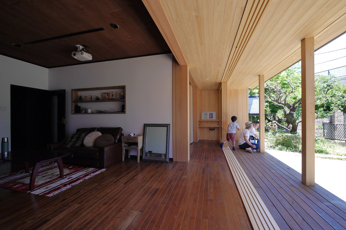 南側外観。1階増築部分の開口部を屋内側にセットバックさせて縁側に改修しました。間口7.5mの縁側は客人を迎える家の顔です。