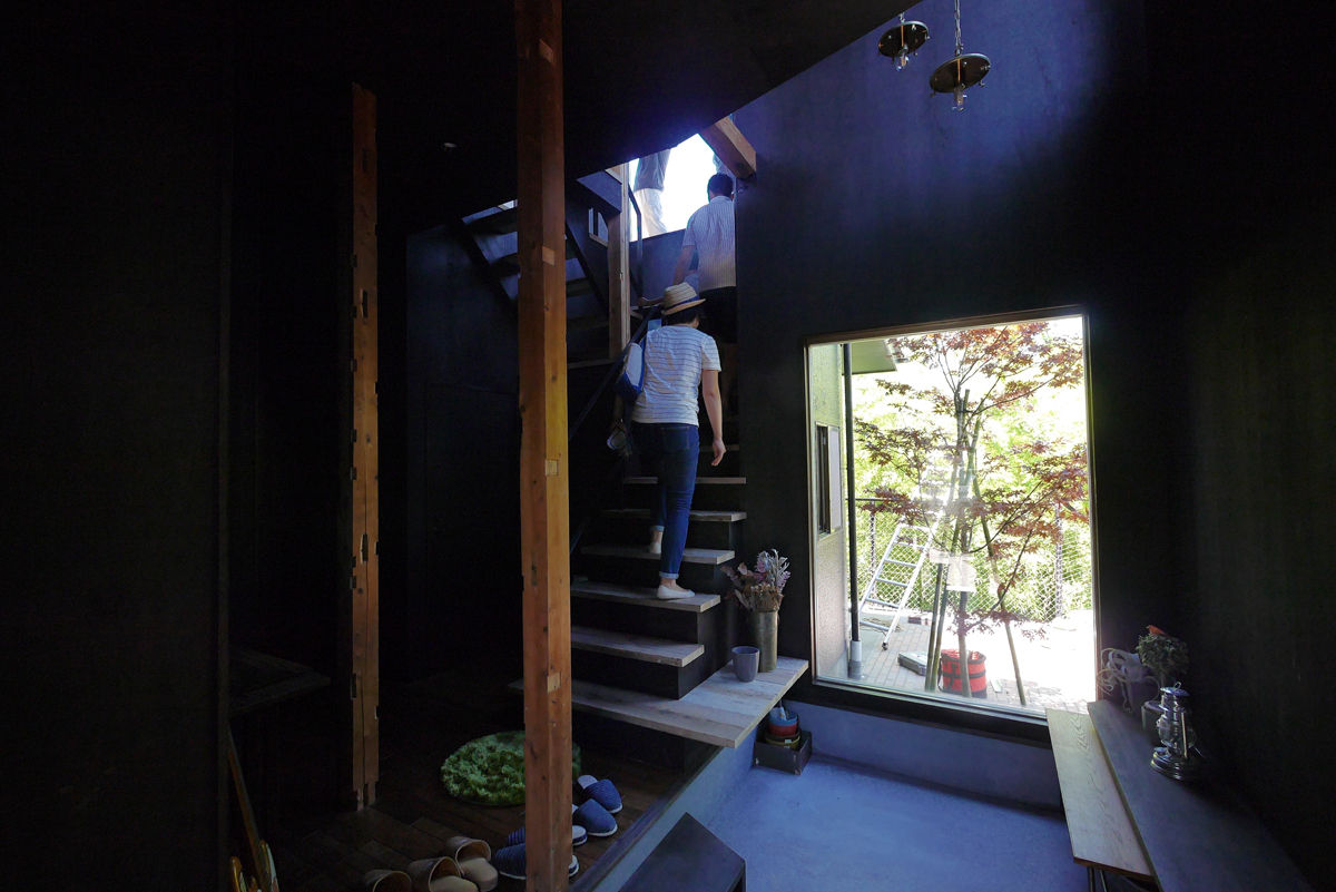 緑が映える黒い玄関。正面の窓から見える木は四季を楽しめるノムラモミジ。