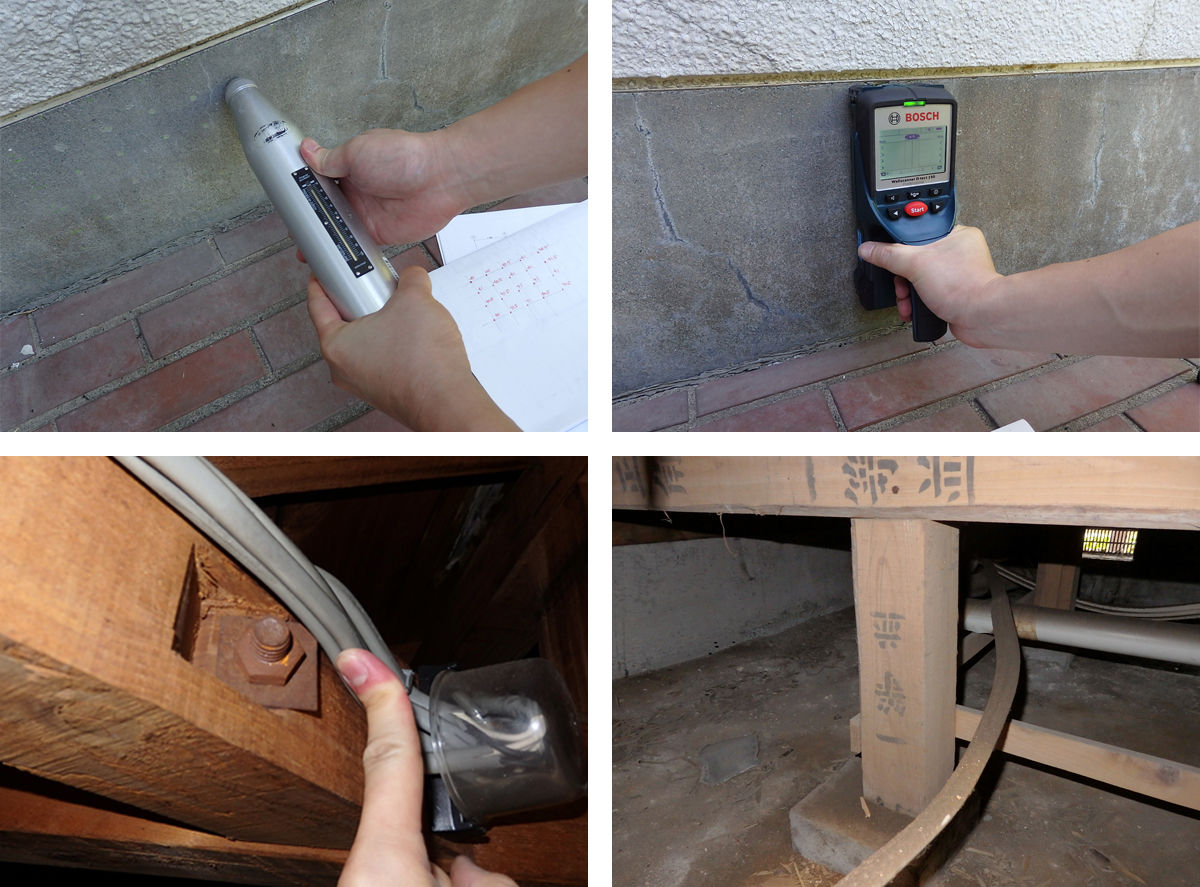 シュミットハンマー、鉄筋探査機による基礎コンクリート調査、柱梁の金物の有無、床下の土台劣化状況などを確認(小山直丈構造設計事務所と共同)