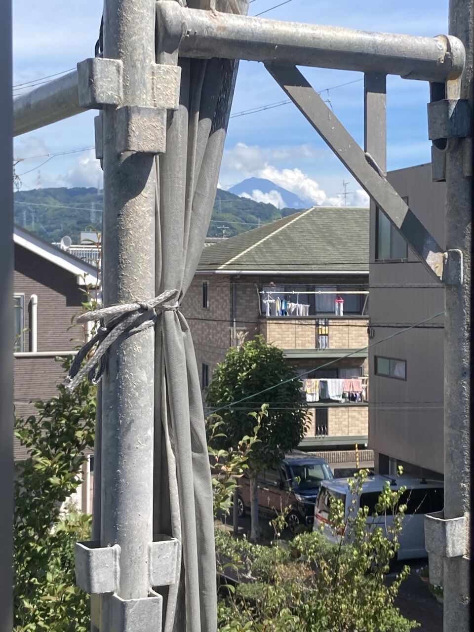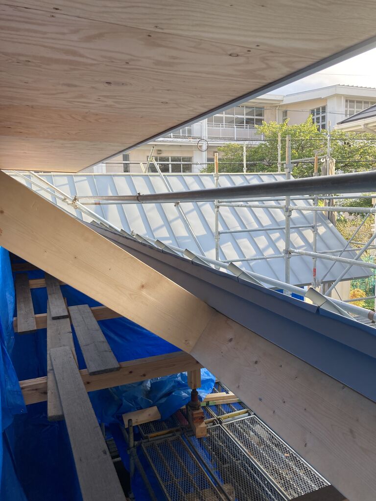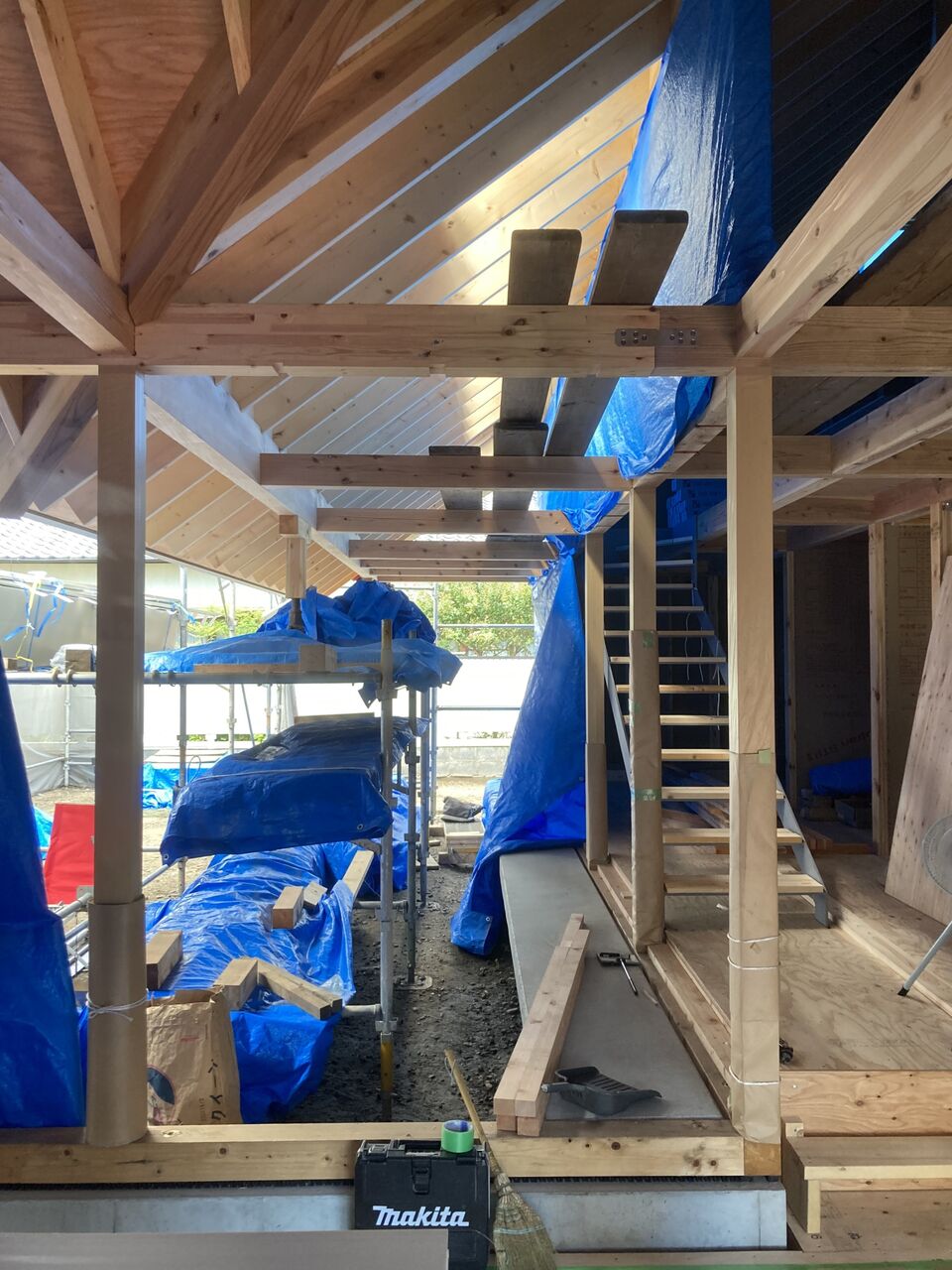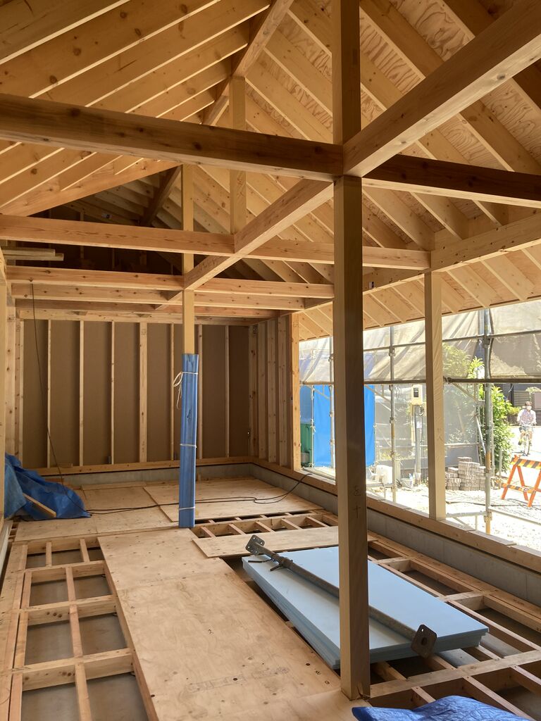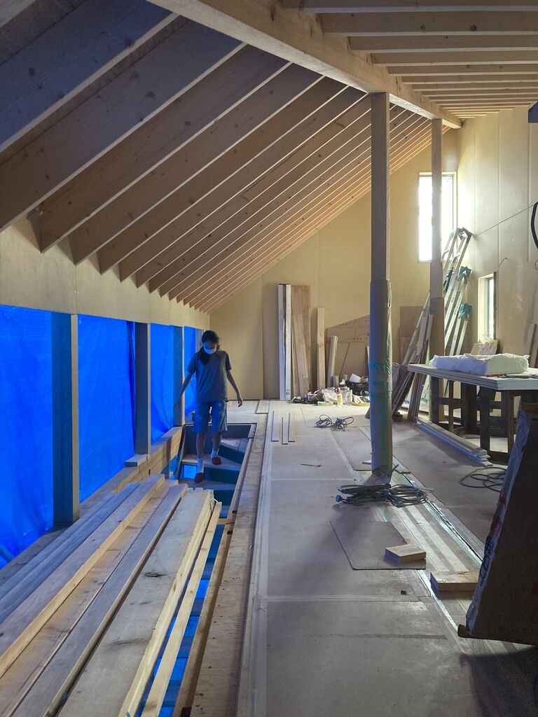 現場進行中の折れ屋根の家。いろいろな方向に視線が抜け、高窓からは富士山が見えます。大きな屋根の下を気持ちのいい風が流れていきます。
