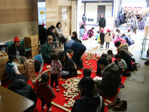 隣の空き店舗を借りて誰でも自由に遊べる待合室にしています。赤い絨毯はリサイクル品。