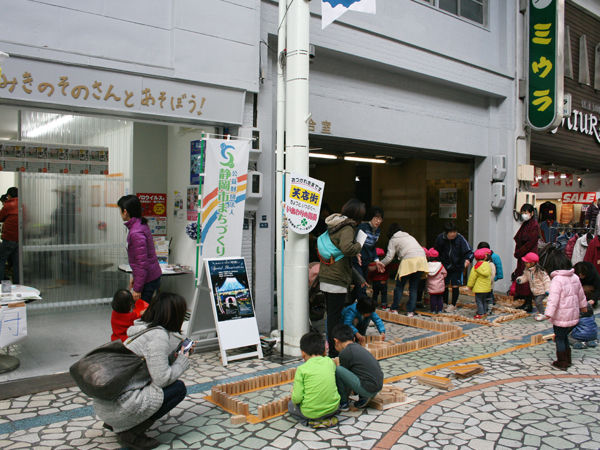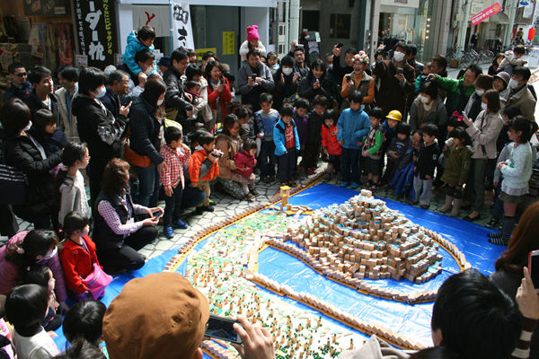 商店街の長さを生かして、長いドミノもつくっています。