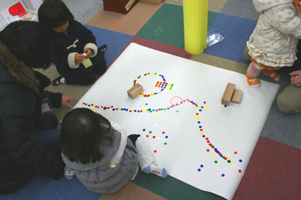 みんなで紙にシールを貼ってかわいい富士山をつくりました。顔中シールの子も(笑)