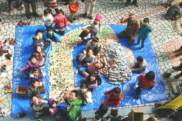記念撮影!最後は参加者みんなで1万個の積木をお片付けして終了です。