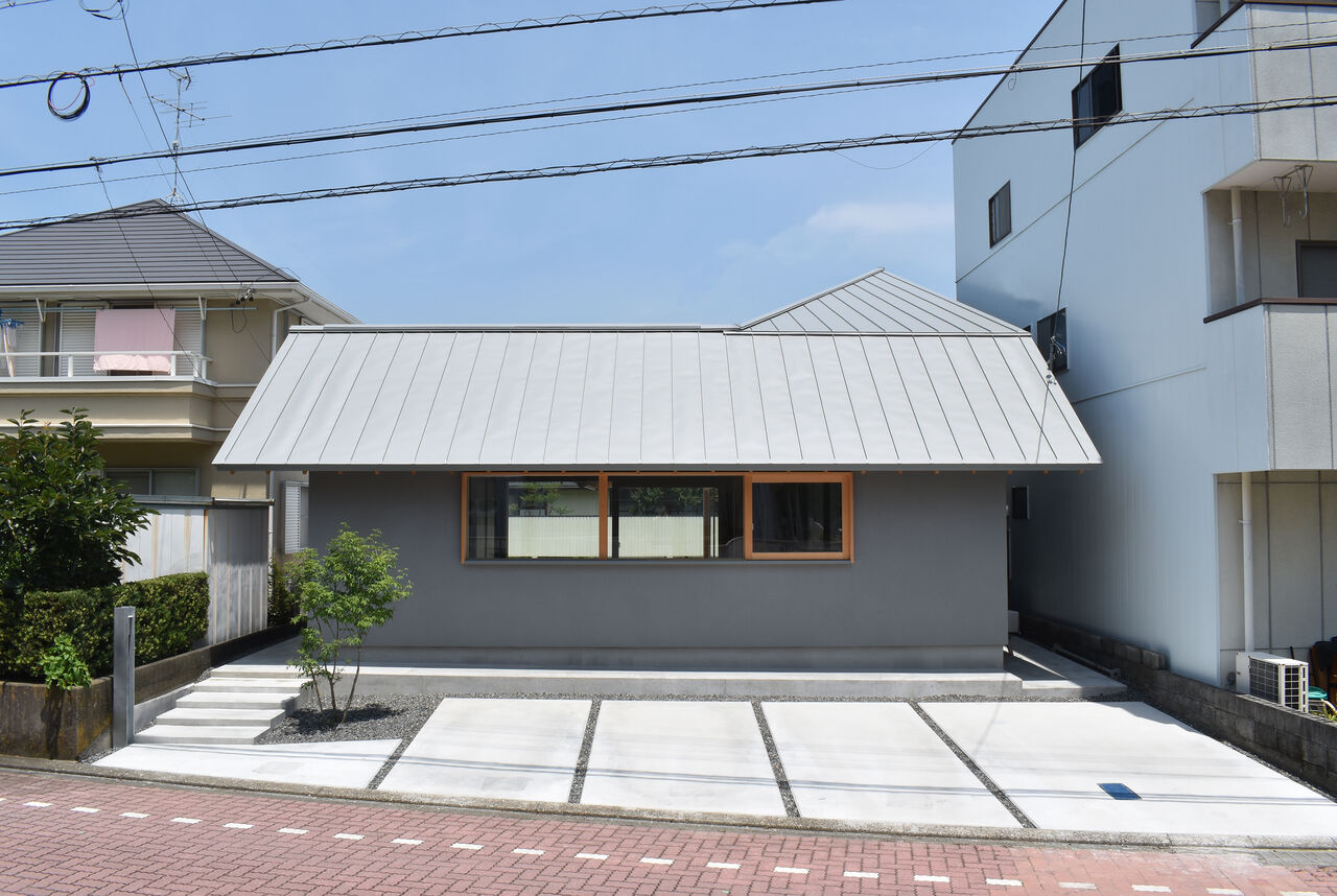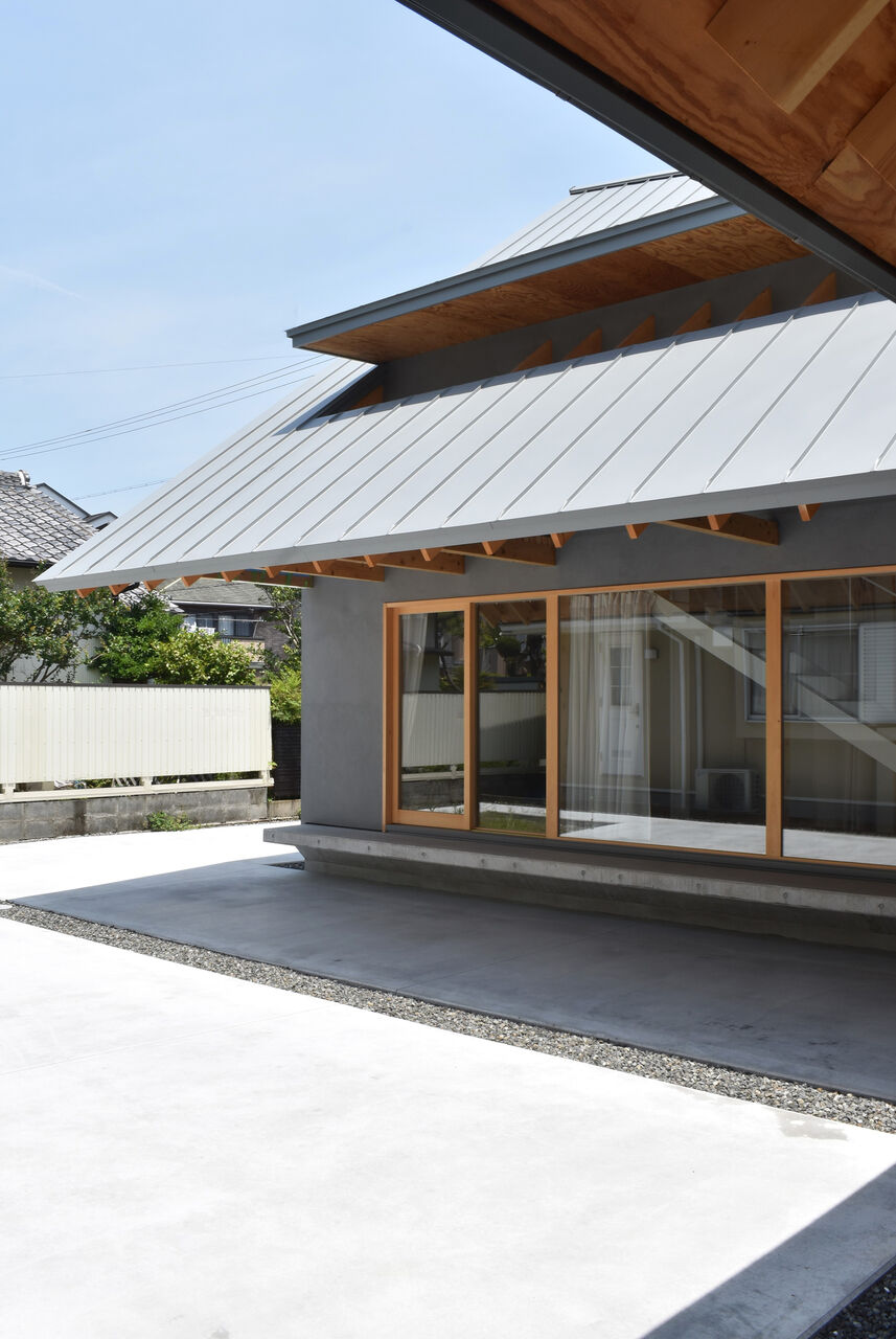 道路側の外観は、一見、軒の低い単純な切妻の平屋に見えますが、敷地の奥に向かって平面的に折れ曲がりながら、床のレベルが徐々に上がる構成となっています。そこに大きな屋根を内から外まで架けることで、敷地全体が一体となった家をつくろうと考えました。