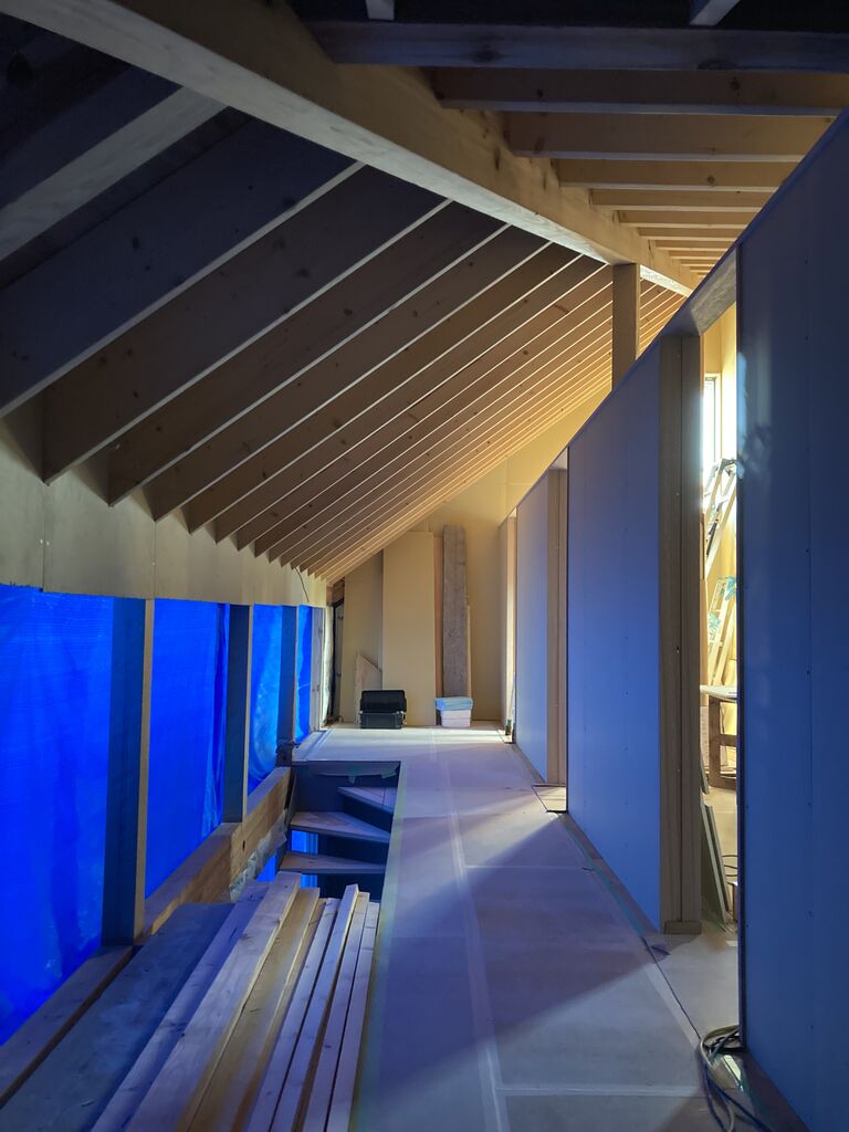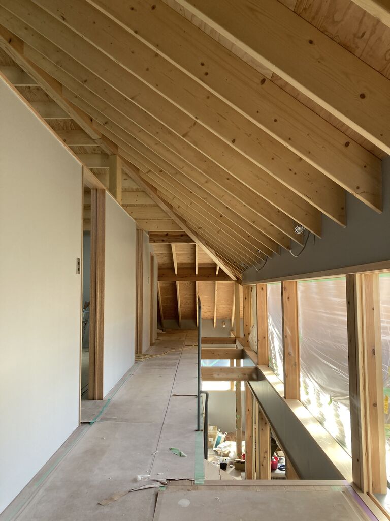 折れ屋根の家は中間検査を終え、順調に工事が進んでいます。