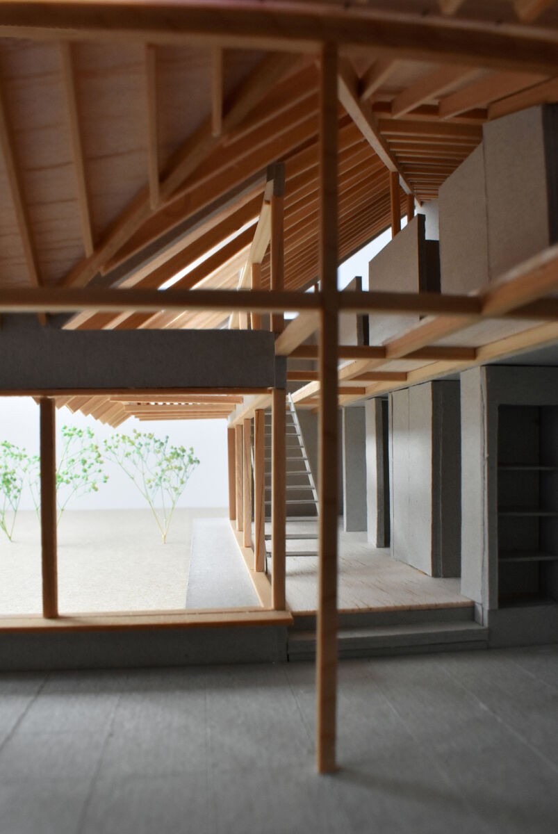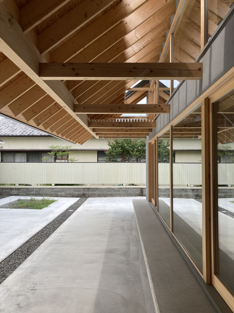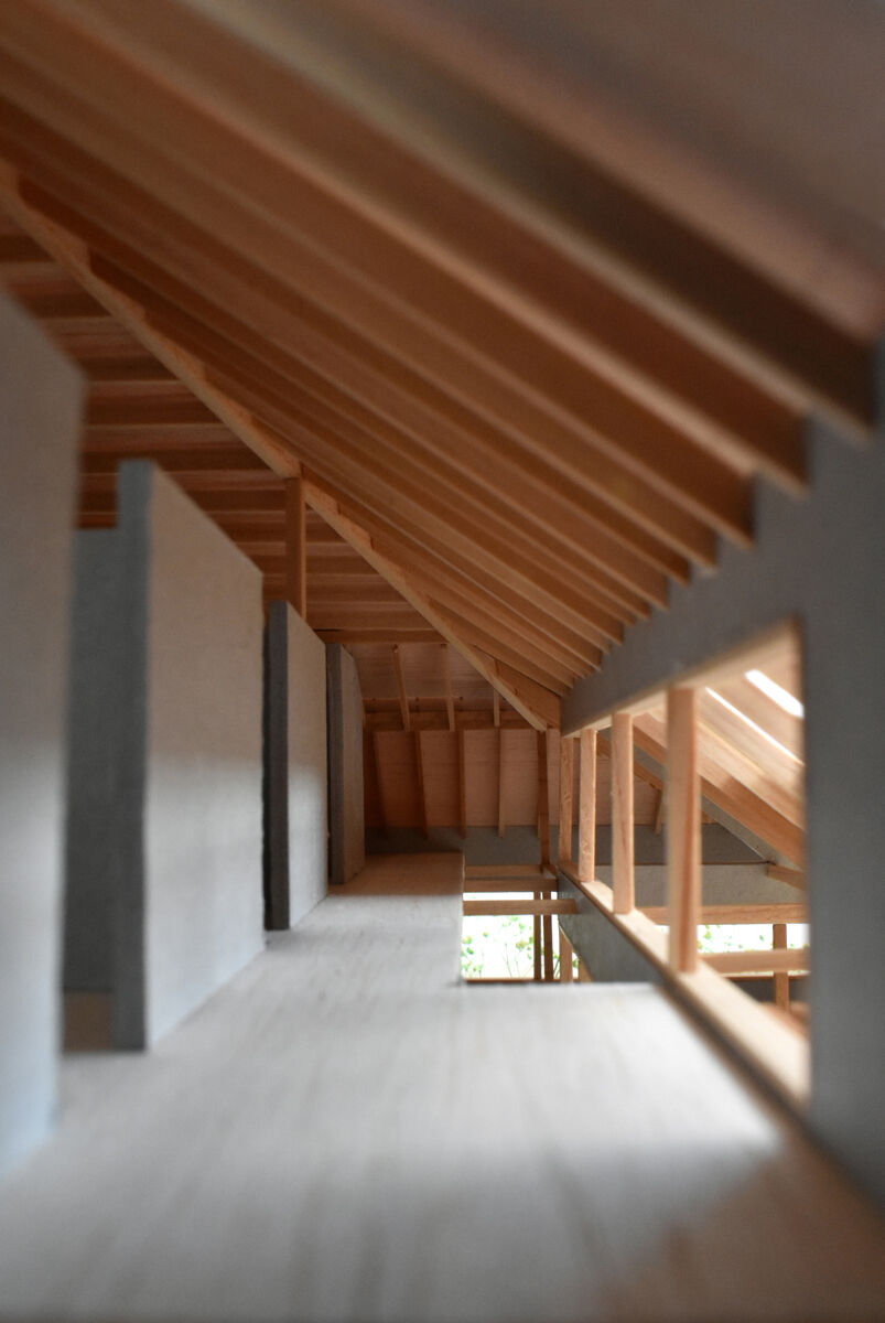「折れ屋根」ができてきました。大屋根は三角形を単位として構成したトラス構造にすることで、2.7mの深い軒下空間をつくります。屋根にはスリットをあけ、視線や日射を遮りつつ、軒下と室内に柔らかい光を届けます。この屋根をL型平面の上に架けることで、建物の剛性を高めています。